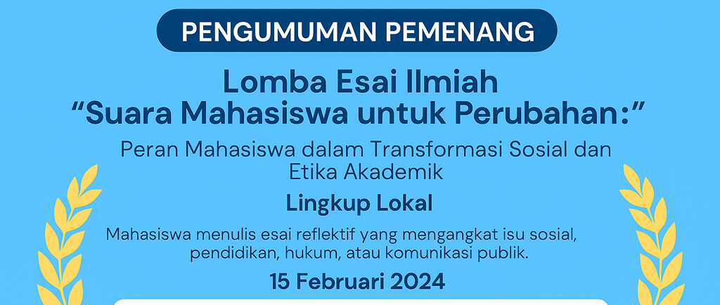 Setelah melalui proses seleksi dan penilaian yang ketat oleh dewan juri lintas disiplin, panitia Lomba Esai Ilmiah “Suara Mahasiswa untuk Perubahan” dengan tema Peran Mahasiswa dalam Transformasi Sosial dan Etika Akademik resmi mengumumkan tiga pemenang terbaik dari kompetisi tingkat lokal ini.
