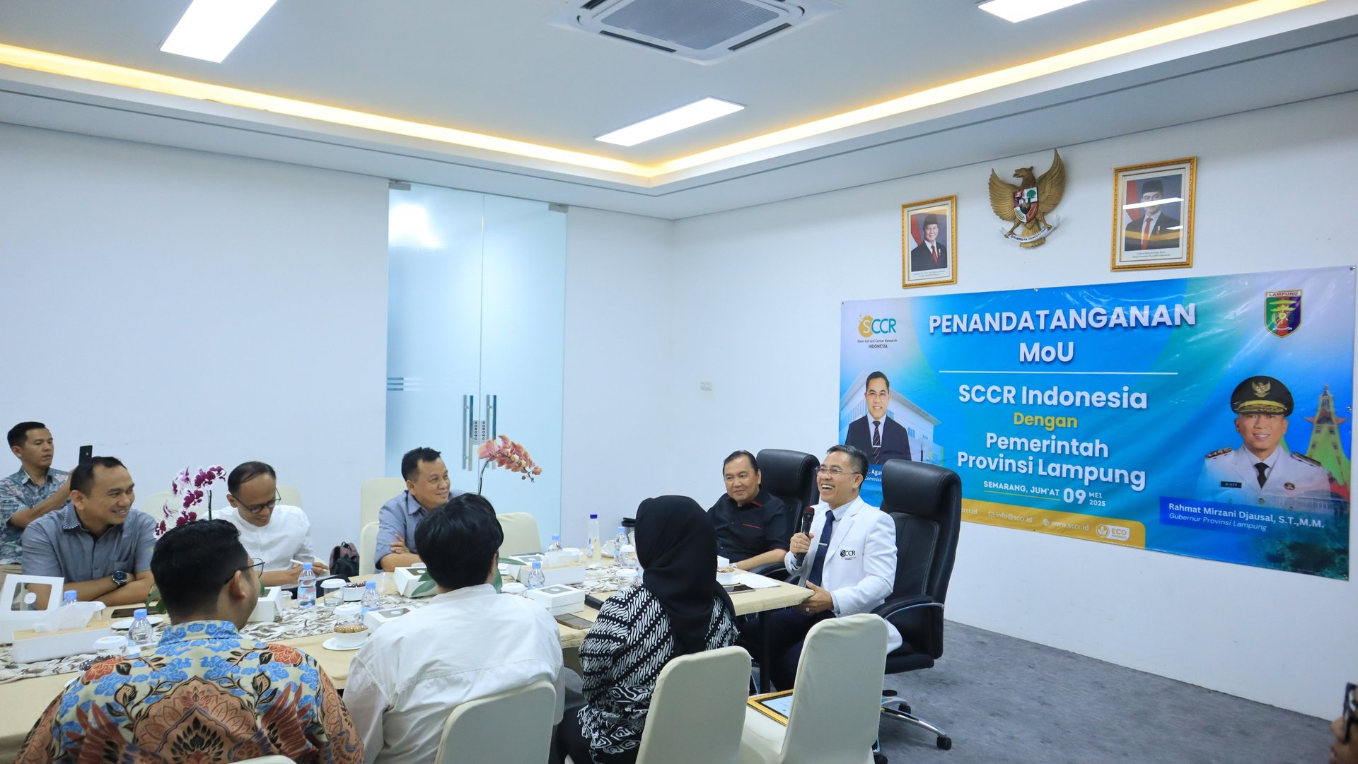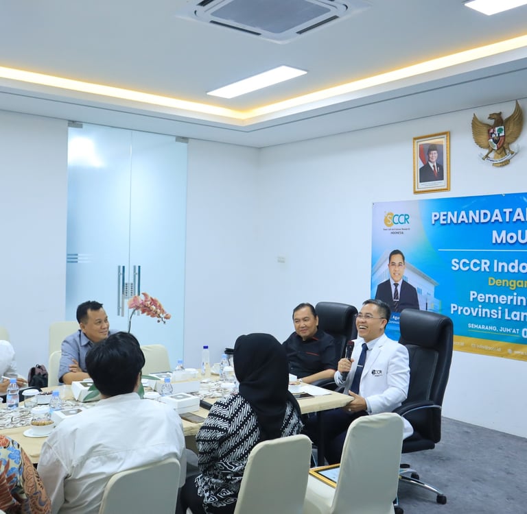 Semarang – Jumat, 9 Mei 2025, SCCR Indonesia di Gunungpati (Mount-G), Semarang, menjadi tuan rumah bagi rombongan penting dari Pemerintah Provinsi Lampung, yang dipimpin langsung oleh Gubernur Lampung, Rahmat Mirzani Djausal, S.T., M.M. Dalam kunjungan ini, kedua pihak menandatangani Nota Kesepahaman (MoU) yang berfokus dalam pendidikan dan pengembangan terapi stem cell, penelitian kanker, dan hilirisasi riset di Provinsi Lampung.