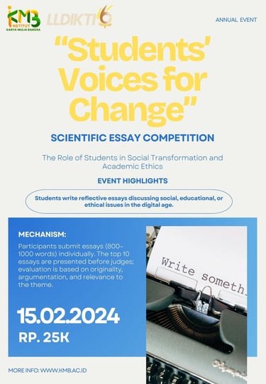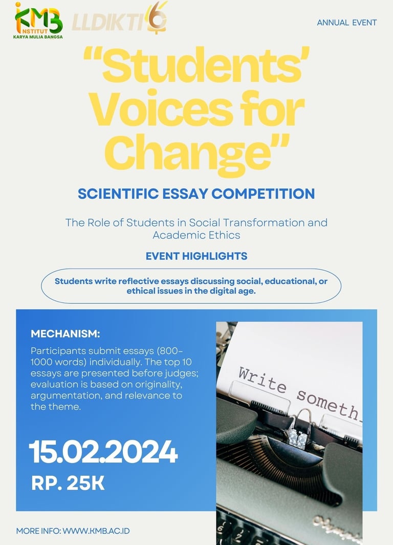 Institut Karya Mulia Bangsa (IKMB) bersama LLDIKTI Wilayah IV mengundang seluruh mahasiswa aktif untuk berpartisipasi dalam kompetisi esai ilmiah tahunan bertajuk Students’ Voices for Change. Kompetisi ini bertujuan mendorong mahasiswa menyuarakan gagasan reflektif mengenai isu sosial, pendidikan, dan etika akademik di era digital.